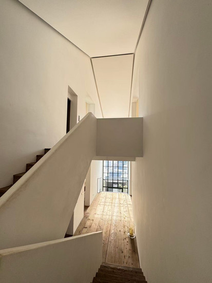 The designer certainly has his own considerations and philosophy, but as a visitor, the furnishings here evoke a sense of minimalist style. The large solid wood floor panels are presented in their raw, unpolished form, and the sparse green plants also appear in their natural, untrimmed state, creating a sense of natural style. The high ceilings, original sloped roof, all-white walls throughout the house, simply shaped furniture, faded light khaki patterned rugs on the floor, cream-colored curtains, tablecloths, staircases, and pure white candles are all filled with Nordic characteristics. If I had to identify an artistic style to interpret this space, the extensive use of white space and color coordination would make me more inclined to classify it as minimalism.
